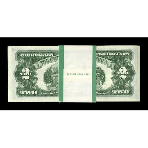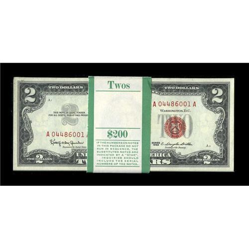 <B>Fr. 1513 $2 1963 Legal Tender Notes. Original Pack of 100 Gem Crisp Uncirculated.</B></I><BR>The margins are quite even and embossing prominent on this strap of red seals.<BR><BR><b>Shipping:</b> Coins & Currency (<a target="_blank" href="http://www.heritageauctions.com/common/shipping.php">view shipping information</a>)