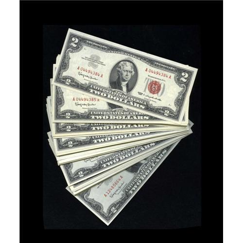 <B>Fr. 1513 One Hundred $2 1963 Legal Tender Notes. Gem Crisp Uncirculated.</B></I><BR>A splendid group of one hundred examples from this later date red seal series in which all of the notes are well margined and well embossed as if they were printed last week.