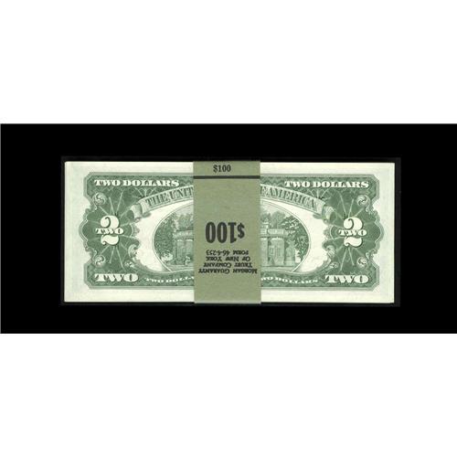 <B>Fr. 1514 $2 1963A Legal Tender Notes. Fifty Consecutive Examples. Gem Crisp Uncirculated.</B></I><BR>The first note shows miniscule handling on this nicely margined run that is wrapped in a Morgan Guaranty $100 band.
