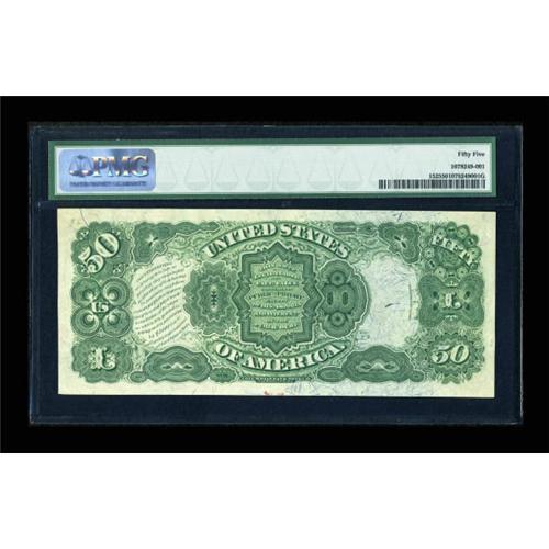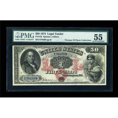 <B>Fr. 152 $50 1874 Legal Tender PMG About Uncirculated 55.</B></I> Forty-four examples of this number are known. PMG has graded twelve of those, with this being the third from the top. The eye appeal of the note is tremendous, with a bold red overprint as opposed to the normal indistinct light pink. All the floral decoration in both the capital "L"s is amazingly sharp, clean and clear. The note is beautifully margined on both sides and, as is typical for these "D" position notes, it has an overly large bottom margin. It's a new note to the census, bringing the total now known up to 45. Two higher-grade examples of this number have recently crossed the six-figure mark: a PCGS 64 realized $103,500 in October of 2005, and we sold a PMG 65 for $115,000 in September of last year. This note, while not technically as nice as either of those, is certainly in the same class for eye appeal. We would expect this Gem-appearing AU to realize right around...<BR><I>From The Thomas M. Flynn Collection</B></I><BR><BR><b>Shipping:</b> Coins & Currency (<a target="_blank" href="http://www.heritageauctions.com/common/shipping.php">view shipping information</a>)