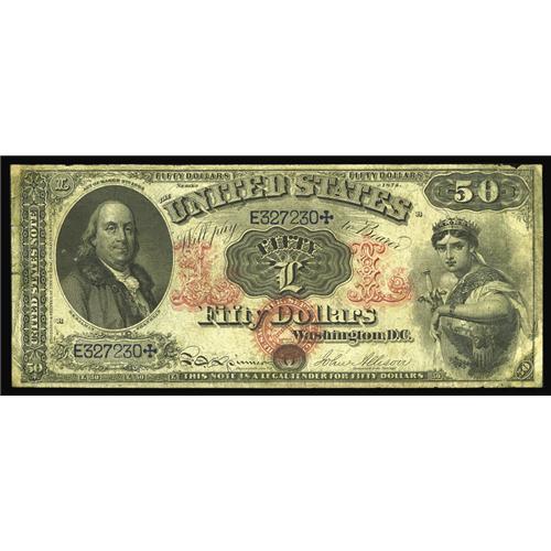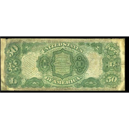 <B>Fr. 152 $50 1874 Legal Tender Very Good-Fine.</B></I> The note has a few very minor edge problems, including a short split at the left, and there are a few inconsequential pinholes. There is a bit more soil than we would like to see, but the red overprint is bold, and the note is, overall, handsome for the grade. In its last auction appearance it realized just over $4,000--a figure that should be surpassed this evening.