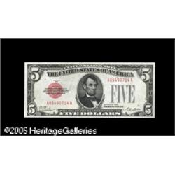 <B>Fr. 1525 $5 1928 Inverted Reverse Legal Tender About Uncirculated.</B></I> This a very scarce error an any early Legal Tender Note. The note is broadly margined and bright, with no problems save for a small discolored area above the right serial number. Lot:15047