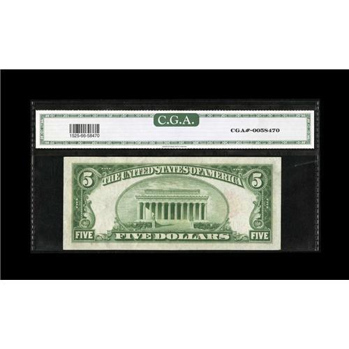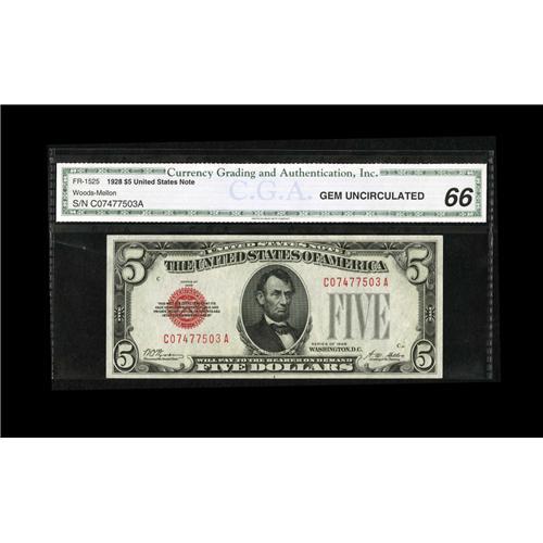 <B>Fr. 1525 $5 1928 Legal Tender Note. CGA Gem Uncirculated 66.</B></I><BR>Natural paper ripple, embossing, wide margins, and dark inks are highlights of this beautiful $5.