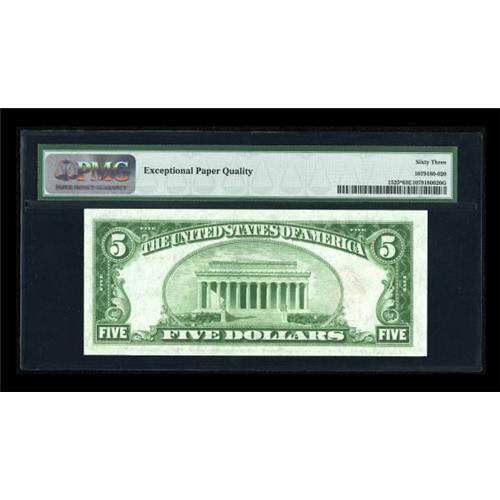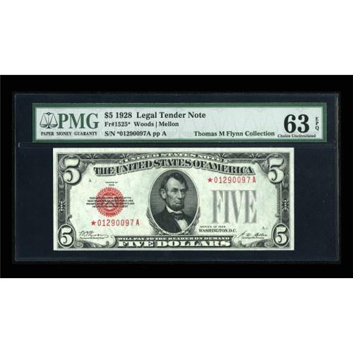<B>Fr. 1525* $5 1928 Legal Tender Note. PMG Choice Uncirculated 63 EPQ.</B></I><BR> A lovely example of the first $5 Legal star, a very scarce note in this grade. The colors are bold and the paper quality totally original. Expect bidding to reach well into the area of...<BR><I>From The Thomas M. Flynn Collection</B></I><BR><BR><b>Shipping:</b> Coins & Currency (<a target="_blank" href="http://www.heritageauctions.com/common/shipping.php">view shipping information</a>)