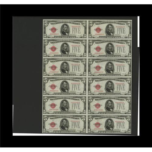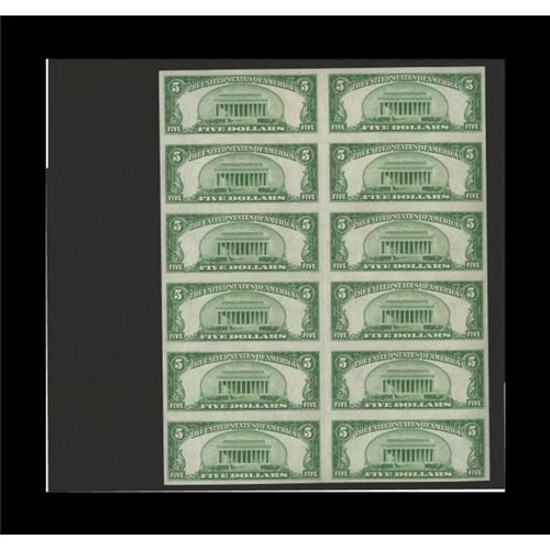<B>Fr. 1525 $5 1928 Legal Tender Note. Uncut Sheet of 12. Crisp Uncirculated.</B></I><BR>This is the last in an extraordinary offering of Series 1928 Legal Tender sheets, one which offers the collector his only chance of obtaining a complete set of these rarities. This sheet is unique in private hands, and is listed as the only one in existence in the new Oakes reference. It's a lovely sheet as well, with great color and eye appeal, and only one centerfold, not touching any of the notes, as the most minor of detractions. With unique items few and far between in numismatics, this one could easily spark a bidding war that carries it well into the six figure range.<BR><I>From The Plymouth Rock Collection</B></I>