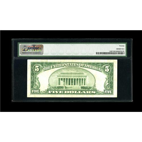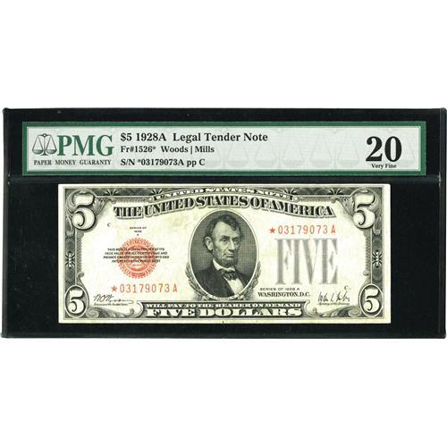 <B>Fr. 1526* $5 1928A Legal Tender Note. PMG Very Fine 20.</B></I><BR>Original surfaces on this star.