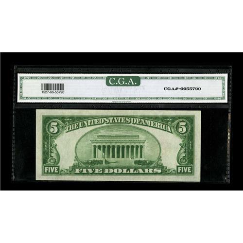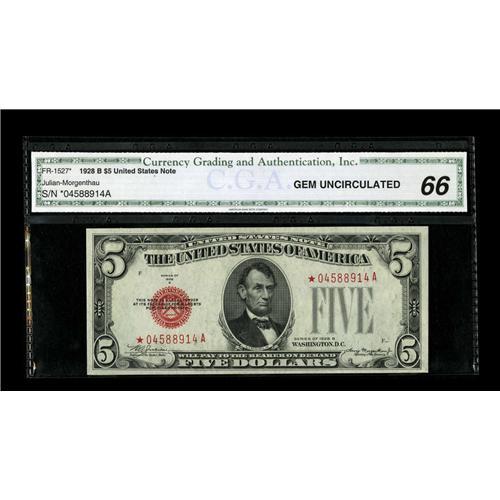 <B>Fr. 1527* $5 1928B Legal Tender Note. CGA Gem Uncirculated 66.</B></I><BR>This Red Seal star is a condition rarity to be sure. While common as dirt in the Very Good-Very Fine range, it is really quite scarce in this state of preservation.<BR><BR><b>Shipping:</b> Coin/Currency (<a target="_blank" href="http://www.heritageauctions.com/common/shipping.php">view shipping information</a>)