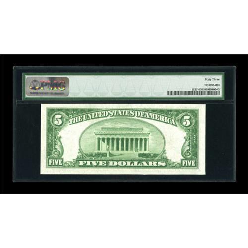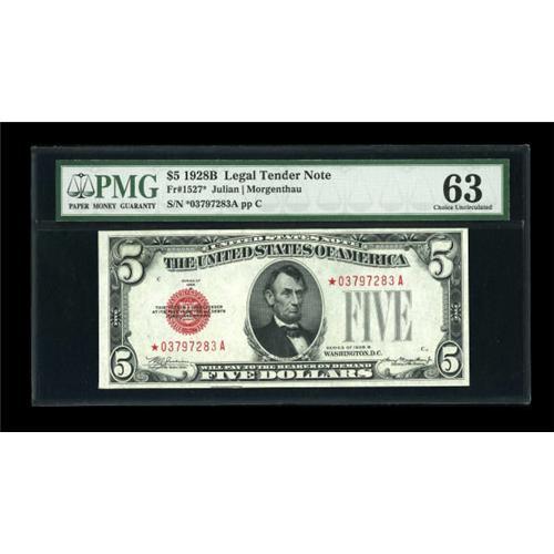 <B>Fr. 1527* $5 1928B Legal Tender Note. PMG Choice Uncirculated 63.</B></I><BR> True uncirculated examples of this popular replacement issue are not at all that common. Expect some serious competition to secure this bright beauty.<BR><BR><b>Shipping:</b> Coins & Currency (<a target="_blank" href="http://www.heritageauctions.com/common/shipping.php">view shipping information</a>)