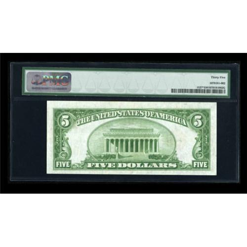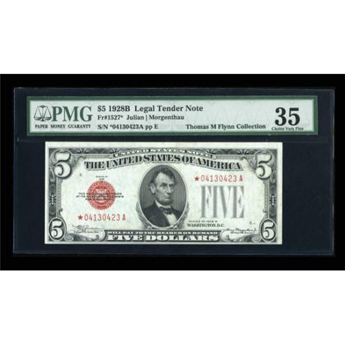 <B>Fr. 1527* $5 1928B Legal Tender Note. PMG Choice Very Fine 35.</B></I><BR> Centered a bit low on the face, but otherwise a bright and good looking star example.<BR><I>From The Thomas M. Flynn Collection</B></I><BR><BR><b>Shipping:</b> Coins & Currency (<a target="_blank" href="http://www.heritageauctions.com/common/shipping.php">view shipping information</a>)