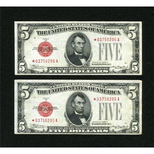 <B>Fr. 1527* $5 1928B Legal Tender Star Notes. Two Consecutive Examples Very Fine-Extremely Fine.</B></I><BR> A lovely pair of these tough replacements which exhibit four folds and plenty of embossing.<BR><BR><b>Shipping:</b> Coins & Currency (<a target="_blank" href="http://www.heritageauctions.com/common/shipping.php">view shipping information</a>)