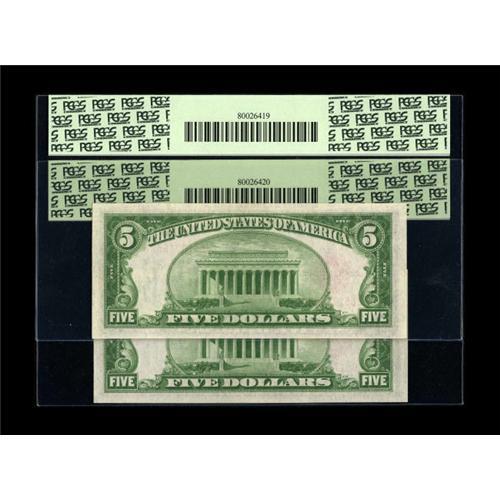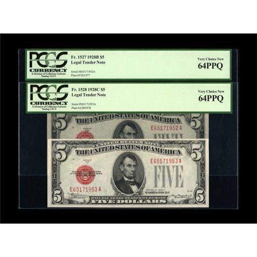 <B>Fr. 1527/Fr. 1528 $5 1928B Mule/1928C Legal Tender Notes. Changeover Pair. PCGS Very Choice New 64PPQ.</B></I><BR>This is one of only two 1928B Mule/1928C changeover pairs listed in Oakes.<BR>