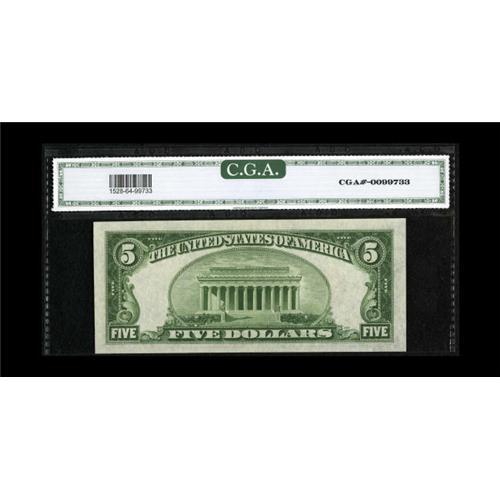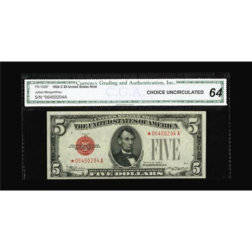 <B>Fr. 1528* $5 1928C Legal Tender Note. CGA Choice Uncirculated 64.</B></I><BR>Star note examples of this issue are quite scare in CU. This piece may be limited to a Choice grade by a smaller than needed bottom margin.