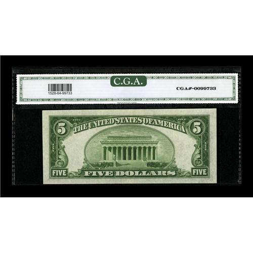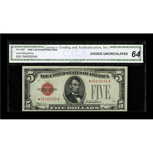 <B>Fr. 1528* $5 1928C Legal Tender Note. CGA Choice Uncirculated 64.</B></I><BR>You would have a more difficult time getting a cup of coffee at Starbucks than you would have finding a well circulated example of this star. With that said, a bright and well margined uncirculated example such as this is an entirely different matter.<BR><BR><b>Shipping:</b> Coin/Currency (<a target="_blank" href="http://www.heritageauctions.com/common/shipping.php">view shipping information</a>)