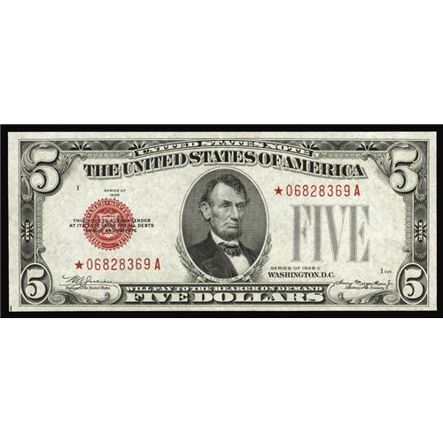 <B>Fr. 1528* $5 1928C Legal Tender Note. Choice About Uncirculated.</B></I><BR>An ever so faint center fold is detected on this Red Seal Star.