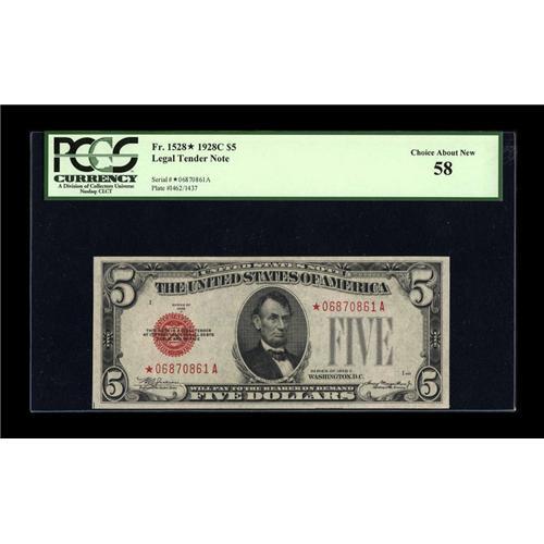<B>Fr. 1528* $5 1928C Legal Tender Note. PCGS Choice About New 58.</B></I><BR>Red seal replacement notes have always fascinated collectors due to their low print runs. This note is vividly crimson hued with adequate margins.<BR><BR><b>Shipping:</b> Coins & Currency (<a target="_blank" href="http://www.heritageauctions.com/common/shipping.php">view shipping information</a>)