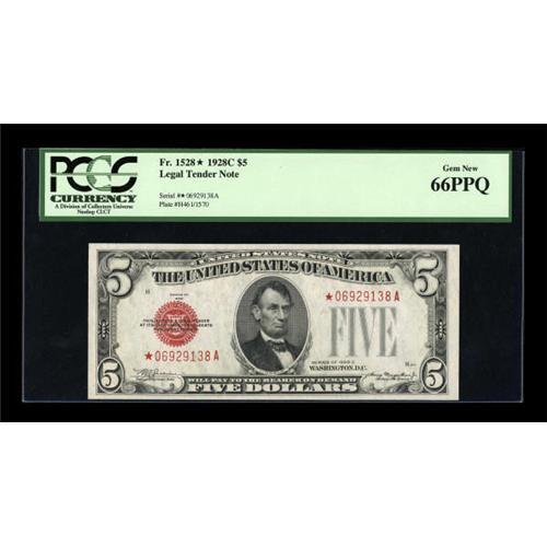 <B>Fr. 1528* $5 1928C Legal Tender Note. PCGS Gem New 66PPQ.</B></I><BR> Broad margins and excellent eye appeal are the main components of this highly rated replacement which is sure to please.<BR><I>From The Drew Keough Collection</B></I><BR><BR><b>Shipping:</b> Coins & Currency (<a target="_blank" href="http://www.heritageauctions.com/common/shipping.php">view shipping information</a>)
