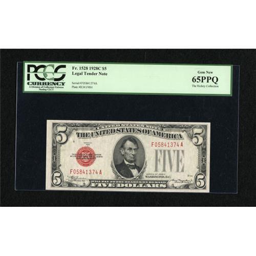<B>Fr. 1528 $5 1928C Legal Tender Note. PCGS Gem New 65PPQ.</B></I><BR> A well embossed note that offers a thick margin at left.<BR><BR><b>Shipping:</b> Coins & Currency (<a target="_blank" href="http://www.heritageauctions.com/common/shipping.php">view shipping information</a>)