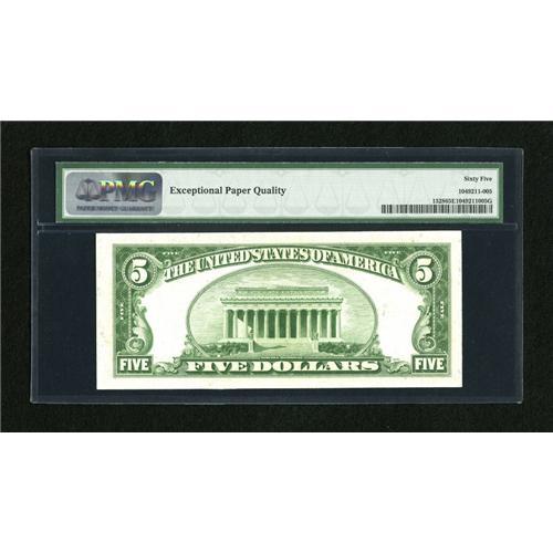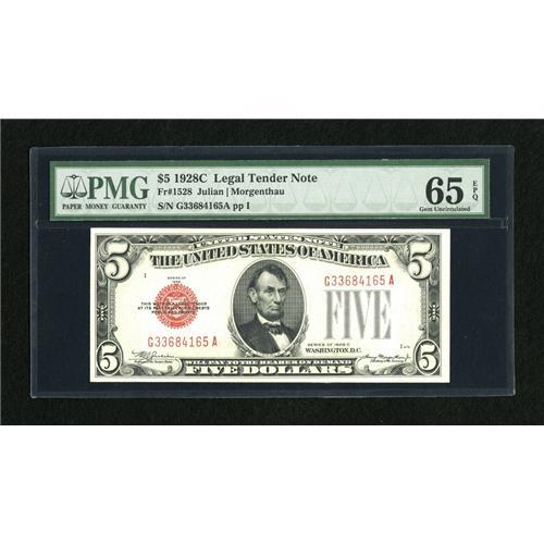 <B>Fr. 1528 $5 1928C Legal Tender Note. PMG Gem Uncirculated 65 EPQ.</B></I><BR>Nearly perfect margins are noted on this piece.<BR><BR><b>Shipping:</b> Coins & Currency (<a target="_blank" href="http://www.heritageauctions.com/common/shipping.php">view shipping information</a>)