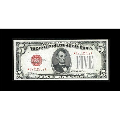 <B>Fr. 1528* $5 1928C Legal Tender Note. Very Choice Crisp Uncirculated.</B></I><BR>A lovely example of this rather underrated star. It's a fully original piece which is just a handling mark from the full gem grade.