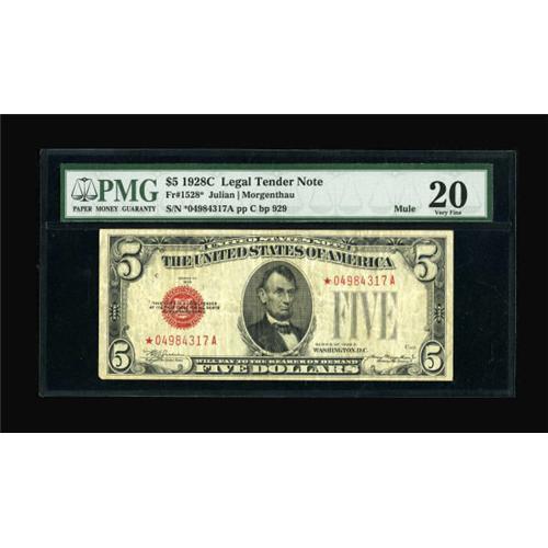 <B>Fr. 1528* $5 1928C Mule Legal Tender Note. PMG Very Fine 20.</B></I><BR> The overprint remains bold on this scarce star mule. Moreover, the problem free paper is a complement to the overprint and the rarity of the issue.<BR><BR><b>Shipping:</b> Coins & Currency (<a target="_blank" href="http://www.heritageauctions.com/common/shipping.php">view shipping information</a>)