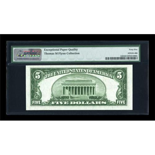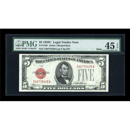 <B>Fr. 1528 $5 1928C Mule Legal Tender Note. PMG Choice Extremely Fine 45 EPQ.</B></I><BR> A lovely example of this very scarce mule which appears uncirculated in the holder. This G-A block mule catalogues at $1400 in VF and $3500 in Choice CU. Expect this example to bring close to the latter price, rather than the former. <BR><I>From The Thomas M. Flynn Collection</B></I><BR><BR><b>Shipping:</b> Coins & Currency (<a target="_blank" href="http://www.heritageauctions.com/common/shipping.php">view shipping information</a>)