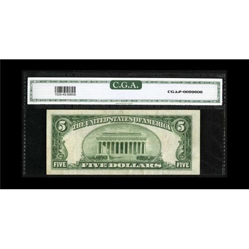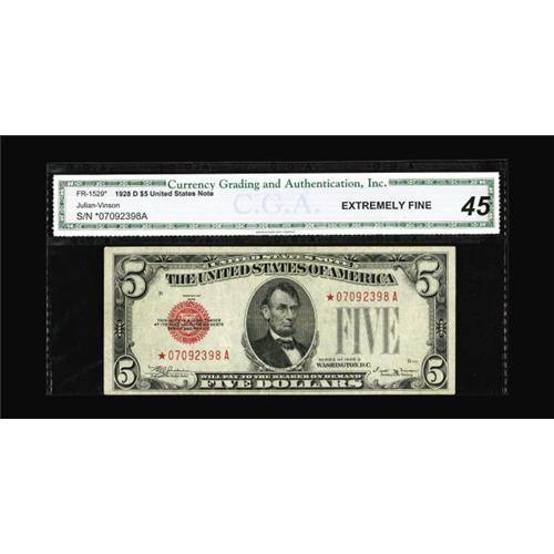 <B>Fr. 1529* $5 1928D Legal Tender Note. CGA Extremely Fine 45.</B></I><BR>No single fold that accounts for the grade is significant, making this an eye appealing replacement note.