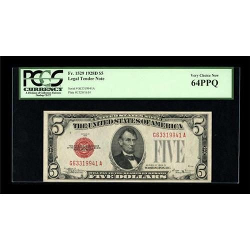 <B>Fr. 1529 $5 1928D Legal Tender Note. PCGS Very Choice New 64PPQ.</B></I><BR> This key to the regular series for this issue serves up deep embossing and even margins.<BR><BR><b>Shipping:</b> Coins & Currency (<a target="_blank" href="http://www.heritageauctions.com/common/shipping.php">view shipping information</a>)