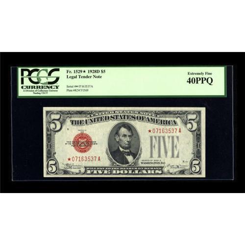 <B>Fr. 1529* $5 1928D Legal Tender Note. PCGS Extremely Fine 40PPQ.</B></I><BR> This is a truly rare star, particularly in grades of Extremely Fine and above. While PCGS has not yet made its population statistics available, PMG has, with its records showing that service having graded only three 1928D $5 Legal stars in all grades combined, with the highest grade a single note in Extremely Fine 40 without the EPQ designation. This piece is bright, nicely centered, and utterly original, with PCGS awarding the note its coveted PPQ designation, indicating its premium paper quality. Expect to see some active bidding on this item, which likely will end in the range of...<BR><BR><b>Shipping:</b> Coins & Currency (<a target="_blank" href="http://www.heritageauctions.com/common/shipping.php">view shipping information</a>)