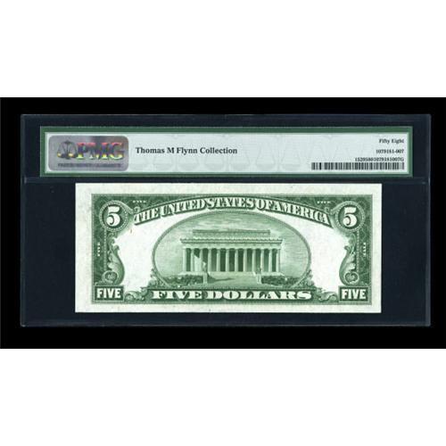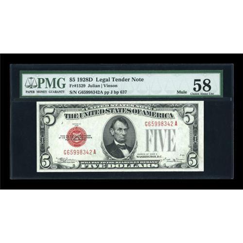 <B>Fr. 1529 $5 1928D Mule Legal Tender Note. PMG Choice About Unc 58.</B></I><BR> Another extremely rare note in all grades, but particularly tough in this state of preservation. This mule is just two serial numbers away from the high reported in Schwartz and Lindquist. <BR><I>From The Thomas M. Flynn Collection</B></I><BR><BR><b>Shipping:</b> Coins & Currency (<a target="_blank" href="http://www.heritageauctions.com/common/shipping.php">view shipping information</a>)