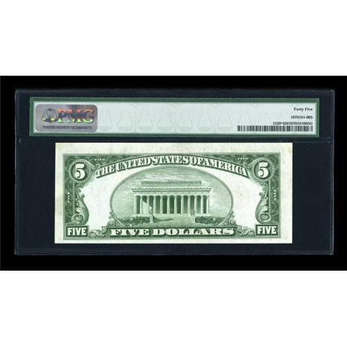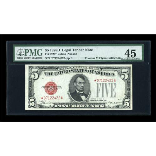 <B>Fr. 1529* $5 1928D Legal Tender Note. PMG Choice Extremely Fine 45.</B></I><BR> A vividly colored and well printed star which displays great eye appeal. It's a truly scarce note in any grade and particularly so this nice. We sold a PCGS graded Extremely Fine 40PPQ in our FUN sale for over $4300, and this example should easily realize that or more.<BR><I>From The Thomas M. Flynn Collection</B></I><BR><BR><b>Shipping:</b> Coins & Currency (<a target="_blank" href="http://www.heritageauctions.com/common/shipping.php">view shipping information</a>)