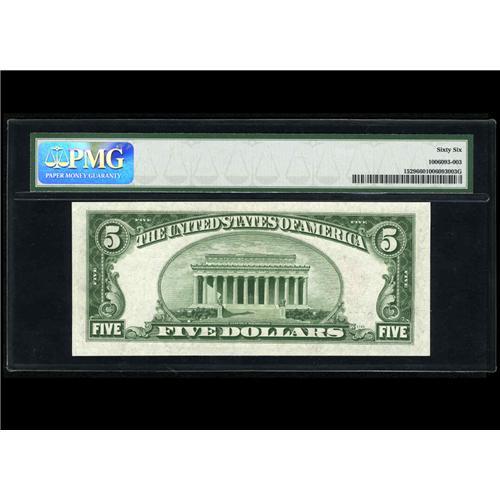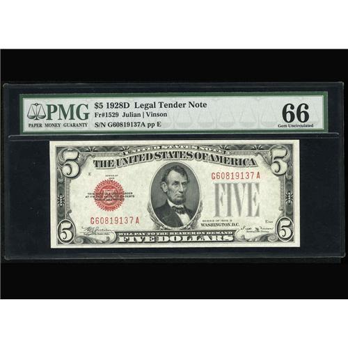 <B>Fr. 1529 $5 1928D Legal Tender Note. PMG Gem Uncirculated 66.</B></I><BR>This embossed key to the $5 Legals is in a wonderful state of preservation.