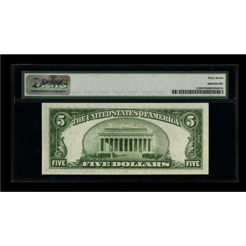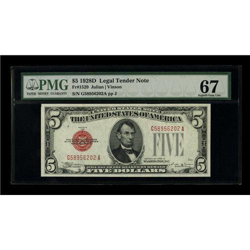<B>Fr. 1529 $5 1928D Legal Tender Note. PMG Superb Gem Unc 67.</B></I><BR>A very bright and well margined example of this key Legal five that has picture perfect centering and bright ink colors.<BR><BR><b>Shipping:</b> Coin/Currency (<a target="_blank" href="http://www.heritageauctions.com/common/shipping.php">view shipping information</a>)