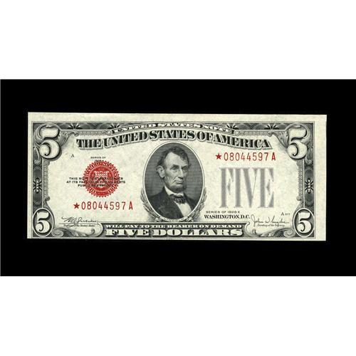 <B>Fr. 1530* $5 1928E Legal Tender Note. Choice Crisp Uncirculated.</B></I><BR>Not a hint of wear is found on this star that possesses embossing and original paper surfaces.<BR><I>From The Bill and Kathy Stella Currency Collection</B></I><BR><BR><b>Shipping:</b> Coin/Currency (<a target="_blank" href="http://www.heritageauctions.com/common/shipping.php">view shipping information</a>)