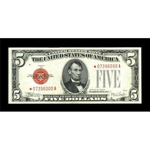 <B>Fr. 1530* $5 1928E Legal Tender Note. Gem Crisp Uncirculated.</B></I><BR> A broadly margined, brightly colored Gem with beautiful eye appeal and excellent centering. The new Schwartz & Lindquist reference value of $1500 in CU seems right on the money given the scarcity of this issue in replacement form.<BR><BR><b>Shipping:</b> Coins & Currency (<a target="_blank" href="http://www.heritageauctions.com/common/shipping.php">view shipping information</a>)