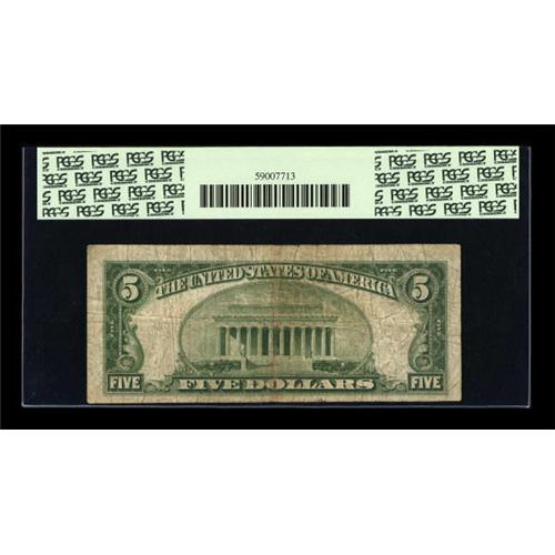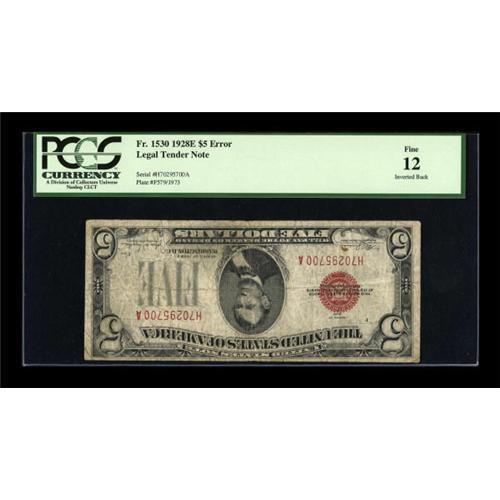 <B>Fr. 1530 $5 1928E Legal Tender Note. PCGS Fine 12.</B></I><BR> From our 2006 FUN auction where the description read, "This is truly a scarce invert on a tough series. This is the first time we have seen this 1928E error at auction. This note circulated extensively until someone realized there was a problem." In that auction this note realized $1265.<BR><I>From The Amelia Island Collection.</B></I><BR><BR><b>Shipping:</b> Coins & Currency (<a target="_blank" href="http://www.heritageauctions.com/common/shipping.php">view shipping information</a>)