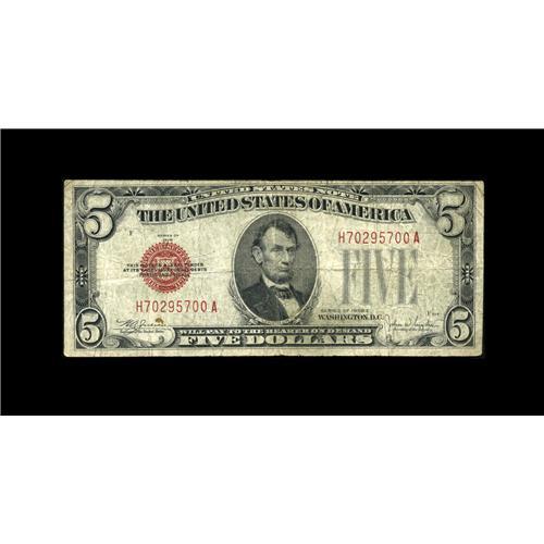 <B>Fr. 1530 $5 1928E Legal Tender Note. Very Good.</B></I> This is truly a scarce invert on a tough series. This is the first time we have seen this 1928E error at auction. This note circulated extensively until someone realized there was a problem.