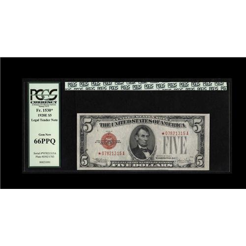 <B>Fr. 1530* $5 1928E Legal Tender Star Note. PCGS Gem New 66PPQ.</B></I><BR>This replacement note has excellent punch thru embossing and vivid overprints and is awarded the PPQ designation due to its overall originality.