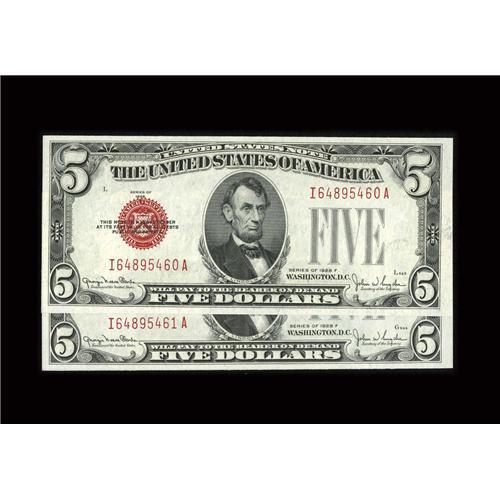 <B>Fr. 1531/1531 $5 1928F/1928F Legal Tender Notes. Changeover Pair. Gem Crisp Uncirculated.</B></I><BR>This is a Wide I to Narrow changeover pair.<BR><BR><b>Shipping:</b> Coin/Currency (<a target="_blank" href="http://www.heritageauctions.com/common/shipping.php">view shipping information</a>)