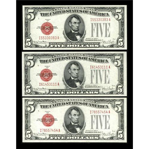 <B>Fr. 1531 $5 1928F Legal Tender Notes. Wide I, Narrow, and Wide II Varieties. Choice Crisp Uncirculated or Better.</B></I><BR> All three printing varieties of this series are included in this lot. With just a bit more centering, this trio would all be solid gems.<BR><I>From The Thomas M. Flynn Collection</B></I><BR><BR><b>Shipping:</b> Coins & Currency (<a target="_blank" href="http://www.heritageauctions.com/common/shipping.php">view shipping information</a>)