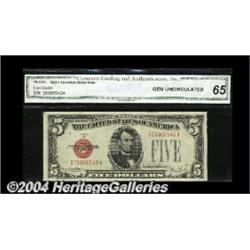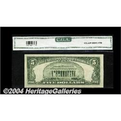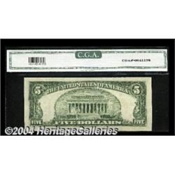 Fr. 1531 $5 1928F Legal Tenders. Two Consecutive Examples. CGA Gem Uncirculated 65.Two consecutive encapsulated, third-party graded "65"s. 2 notes <BR><BR><B>Important notice:</B> Heritage usually auctions material at the rate of 200-250 lots per hour. On some occasions eBay Live bid software or the Internet may not be able to keep up with the pace of the auction. We recommend placing a realistic absentee bid now as insurance to avoid disappointment. Occasionally the auctioneer may eliminate or reject an eBay Live bid, and the auctioneer may also reopen a lot after the close of the eBay live bidding (usually because we missed an audience bid), and may reject your bid even if it shows you as the winning bidder. By bidding via eBay Live, you agree that Heritage may award the lot to another bidder at its sole discretion under the circumstances described above or any other reasonable circumstances. Since eBay bids are not shown to us until we open the lot on the floor, we treat those bids just like floor bids. In most cases the floor responds before the eBay bid is presented to us, due to Internet lag time, so for consistency we have made it a policy that floor bids are always considered first over tie eBay live bids. Also please note that all Heritage lots purchased through eBay Live carry a 20% Buyer's Premium. Please make sure you read the Terms and Conditions before you bid. <BR><BR><B>IMPORTANT ANNOUNCEMENT ABOUT RESERVES:</B> Heritage now divulges all reserves on its web site 7 days before every auction. If you want to know whether the reserve on this lot has been met, and if not, what the reserve amount is, please visit this lot page on the HeritageCoin.com web site, or email: bid@HeritageGalleries.com