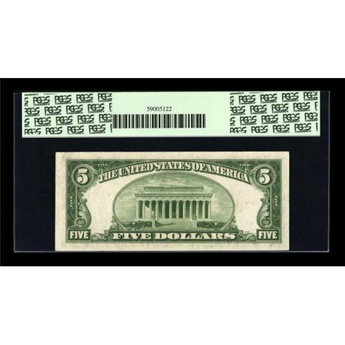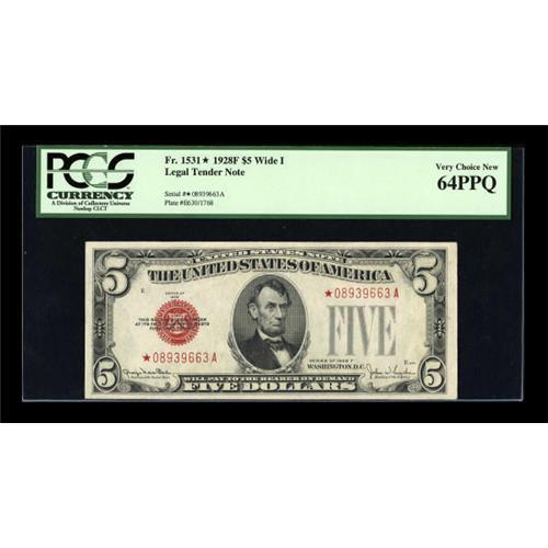 <B>Fr. 1531* $5 1928F Wide I Legal Tender Note. PCGS Very Choice New 64PPQ.</B></I><BR> Treasury Seal embossing and rolling paper wave is viewed through the third-party holder.<BR><I>From The Drew Keough Collection</B></I><BR><BR><b>Shipping:</b> Coins & Currency (<a target="_blank" href="http://www.heritageauctions.com/common/shipping.php">view shipping information</a>)