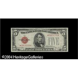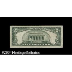 Fr. 1531* $5 1928F Wide II Legal Tender Note. Fine-Very <B>Fr. 1531* $5 1928F Wide II Legal Tender Note. Fine-Very Fine.</B></I><BR>An evenly circulated and problem free example of this just plain rare star note which catalogues for $2000 in Very Fine in the new edition of Oakes. This piece, which we've graded Fine-Very Fine, is a lot closer to the higher grade than the lower. <BR><BR><B>Important notice:</B> Heritage usually auctions material at the rate of 200-250 lots per hour. On some occasions eBay Live bid software or the Internet may not be able to keep up with the pace of the auction. We recommend placing a realistic absentee bid now as insurance to avoid disappointment. Occasionally the auctioneer may eliminate or reject an eBay Live bid, and the auctioneer may also reopen a lot after the close of the eBay live bidding (usually because we missed an audience bid), and may reject your bid even if it shows you as the winning bidder. By bidding via eBay Live, you agree that Heritage may award the lot to another bidder at its sole discretion under the circumstances described above or any other reasonable circumstances. Since eBay bids are not shown to us until we open the lot on the floor, we treat those bids just like floor bids. In most cases the floor responds before the eBay bid is presented to us, due to Internet lag time, so for consistency we have made it a policy that floor bids are always considered first over tie eBay live bids. Also please note that all Heritage lots purchased through eBay Live carry a 20% Buyer's Premium. Please make sure you read the Terms and Conditions before you bid. This lot is being auctioned in conjunction with a live floor auction by Heritage Galleries & Auctioneers. All final auction and invoice information will be supplied by Heritage Galleries & Auctioneers, and all other information should be considered preliminary. Lot:16183