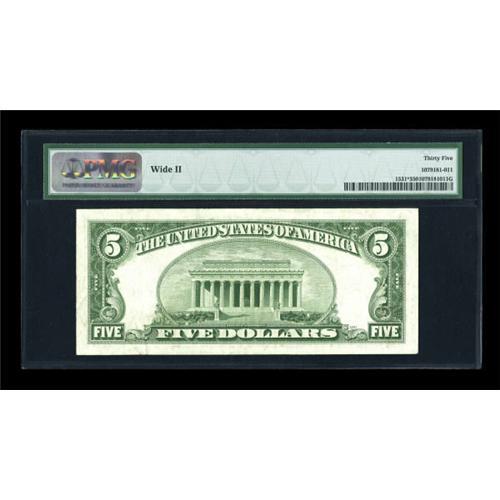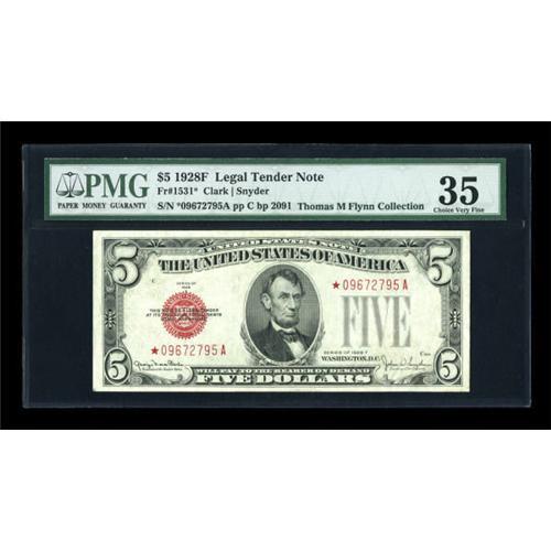 <B>Fr. 1531* $5 1928F Wide II Legal Tender Note. PMG Choice Very Fine 35.</B></I><BR> This piece bears the high number for this rare star in the Schwartz and Lindquist reference. PMG has followed its usual path and been very conservative in their grading of this note, as it certainly appears far nicer than Choice Very Fine in the holder. <BR><I>From The Thomas M. Flynn Collection</B></I><BR><BR><b>Shipping:</b> Coins & Currency (<a target="_blank" href="http://www.heritageauctions.com/common/shipping.php">view shipping information</a>)