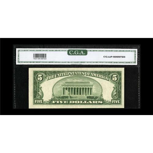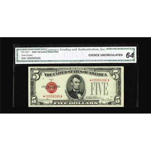 <B>Fr. 1531* $5 1928F Wide Legal Tender Note. CGA Choice Uncirculated 64.</B></I><BR>Some light handling in the bottom margin is noted on this note which features some of its original embossing.