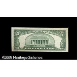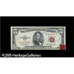<B>Fr. 1532 $5 1953 Legal Tender Crisp Uncirculated.</B></I> A fabulous and very rare Legal Tender mismatch which left the Bureau despite (or perhaps because of) a red inspector's rejection flag and a deep blue circle crayoned around the right serial number. This attractive and most distinctive example is the sole Legal Tender mismatch which our consignor could obtain during his long years of diligent searching. Lot:15184