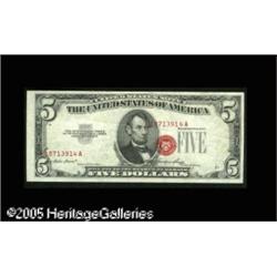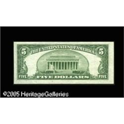 <B>Fr. 1532 $5 1953 Legal Tender Note. Extremely Fine.</B></I><BR>The third printing is shifted so far left that the prefix letter of the right serial number has wound up on Lincoln's forehead. A rare error to find on a Legal Tender note. Lot:15229