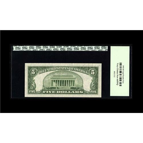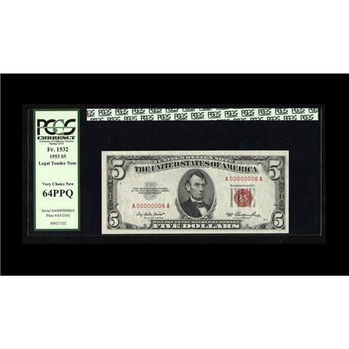 <B>Fr. 1532 $5 1953 Legal Tender Note. PCGS Very Choice New 64PPQ.</B></I><BR>This single digit red seal bears serial number A00000006A. Low digit numbers are exceedingly scarce on red seal notes.<BR><I>From the Scottsdale Collection</B></I>