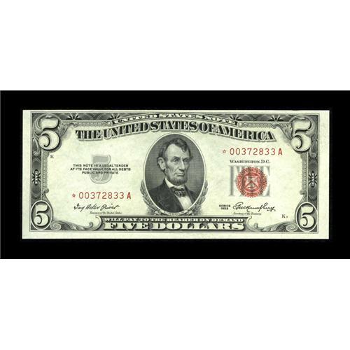 <B>Fr. 1532* $5 1953 Legal Tender Note. Very Choice Crisp Uncirculated.</B></I><BR>A tight top margin does little to distract from the wholly original and crackling fresh paper.<BR><I>From The Bill and Kathy Stella Currency Collection</B></I><BR><BR><b>Shipping:</b> Coin/Currency (<a target="_blank" href="http://www.heritageauctions.com/common/shipping.php">view shipping information</a>)