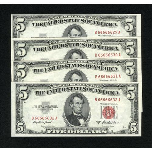 <B>Fr. 1533 $5 1953A Legal Tender Notes. Four Consecutive Examples. Crisp Uncirculated.</B></I><BR> Six sixes start the serial number on each of these lovely B-A block red seals.<BR><BR><b>Shipping:</b> Coins & Currency (<a target="_blank" href="http://www.heritageauctions.com/common/shipping.php">view shipping information</a>)