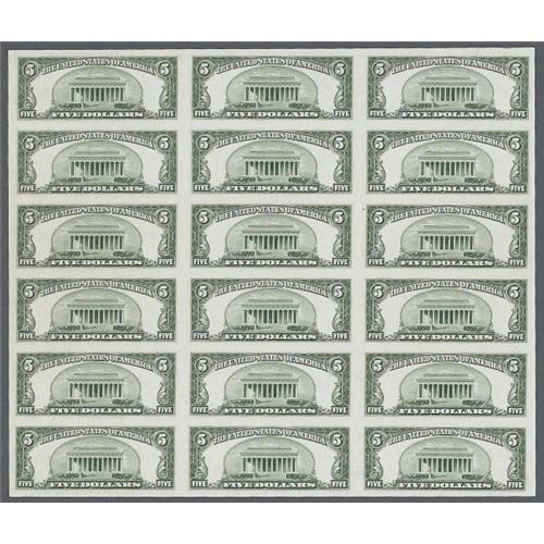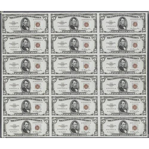 <B>Fr. 1532 $5 1953 Legal Tender Notes. Uncut Sheet of 18. Choice Crisp Uncirculated.</B></I><BR>A beautiful uncut sheet with broad margins and sharp corners that is bright and crisp throughout. Only 100 uncut sheets were originally issued, while approximately 25 survive uncut today. At our 2005 Long Beach sale, sheet # 40, listed as Gem, brought just over $4,000.We A rare item that is a must for the small size currency specialist.<BR><BR><b>Shipping:</b> Coin/Currency (<a target="_blank" href="http://www.heritageauctions.com/common/shipping.php">view shipping information</a>)